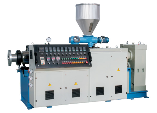 設備特點: 錐形雙螺桿擠出機是一種適合于各類PVC粉料擠出成形的專用設備。配備不同模具及輔機可以生產各類PVC塑料管材、異型材、板材、片材、棒材及造粒。 螺桿采用油冷卻系統冷卻。機筒采用特殊風冷卻系統冷卻。系統采用專用電腦控制。根據用戶不同配方要求,配制結構合理螺桿,以達到塑化狀態及物流質量。螺桿全部采用高精度專用數控螺桿銑床加工,可確保每臺同類擠出設備擠出性能高度一致性。率先引入國際先進變螺距,變深度螺桿設計技術,使物流在螺桿中剪切、壓縮更柔和,更接近實際需要。分配箱特殊設計,推力軸承格外加大,軸承采用原裝進口,傳動壽命高,可承受更大擠出壓力。電器系統采用進口原件,并具有多項故障報警功能,故障少,排除方便。冷卻系統設計特殊,散熱面積格外加大,冷卻迅速,溫控精度可達±1℃。