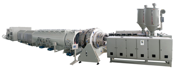 設備特點: PE系列塑料管材生產線主要用于生產農用給排水、建筑給排水、線纜敷設等方面。該機組由真空定型臺、牽引機、切割機、翻料架等組成。單螺桿擠出機及牽引機采用進口交流變頻調速裝置,真空泵及牽引電機均采用優質產品。牽引機有二爪、三爪、四爪、六爪、八爪、十爪、十二爪等牽引方式。可選用無屑切割、鋸片切割或行星切割,機組性能可靠、生產效率高。本公司可以根據用戶的要求,配備專用裝置后生產內壁螺旋管、內壁空心管和芯層發泡管機組更換擠出機,可以生產PP、PE、ABS、PPR、PEX、硅芯管等其它物料管材。行星切割機采用全自動電腦數控,具有操作方便,性能可靠等優點。