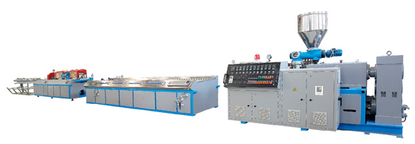 設(shè)備特點(diǎn): YF系列PVC異型材生產(chǎn)線主要用于PVC門窗型材、寬幅門板、窗臺板、多孔穿線管(四孔、六孔、七孔、九孔等)擠出。該生產(chǎn)線可以根據(jù)不同型材 斷面及模具,選用不同規(guī)格的平行(錐形)雙螺桿擠出機(jī),并配置相應(yīng)的真空定型臺,牽引機(jī),切割機(jī),翻料平臺等輔助設(shè)備。 主機(jī)擠出量可以在每小時60公斤到700公斤之間任選。 牽引機(jī)采用我公司獨(dú) 特升降技術(shù),工作平穩(wěn),可靠性好,牽引力大。真 空定型采用特殊加大渦流冷卻系統(tǒng),便于冷卻定型,以滿足高速擠出的需要。切割機(jī)移動速度與牽引速度保持同步,全部動作采 用進(jìn)口PLC電腦控制,設(shè)計(jì)合理,運(yùn)行穩(wěn)定,可自動定長切割,并配備粉塵回收裝置。 根據(jù)不同的模具,定型臺可選用4米、6米 、8米、11米等規(guī)格。配置平行雙螺桿擠出機(jī),特別適用于型材高速擠出。